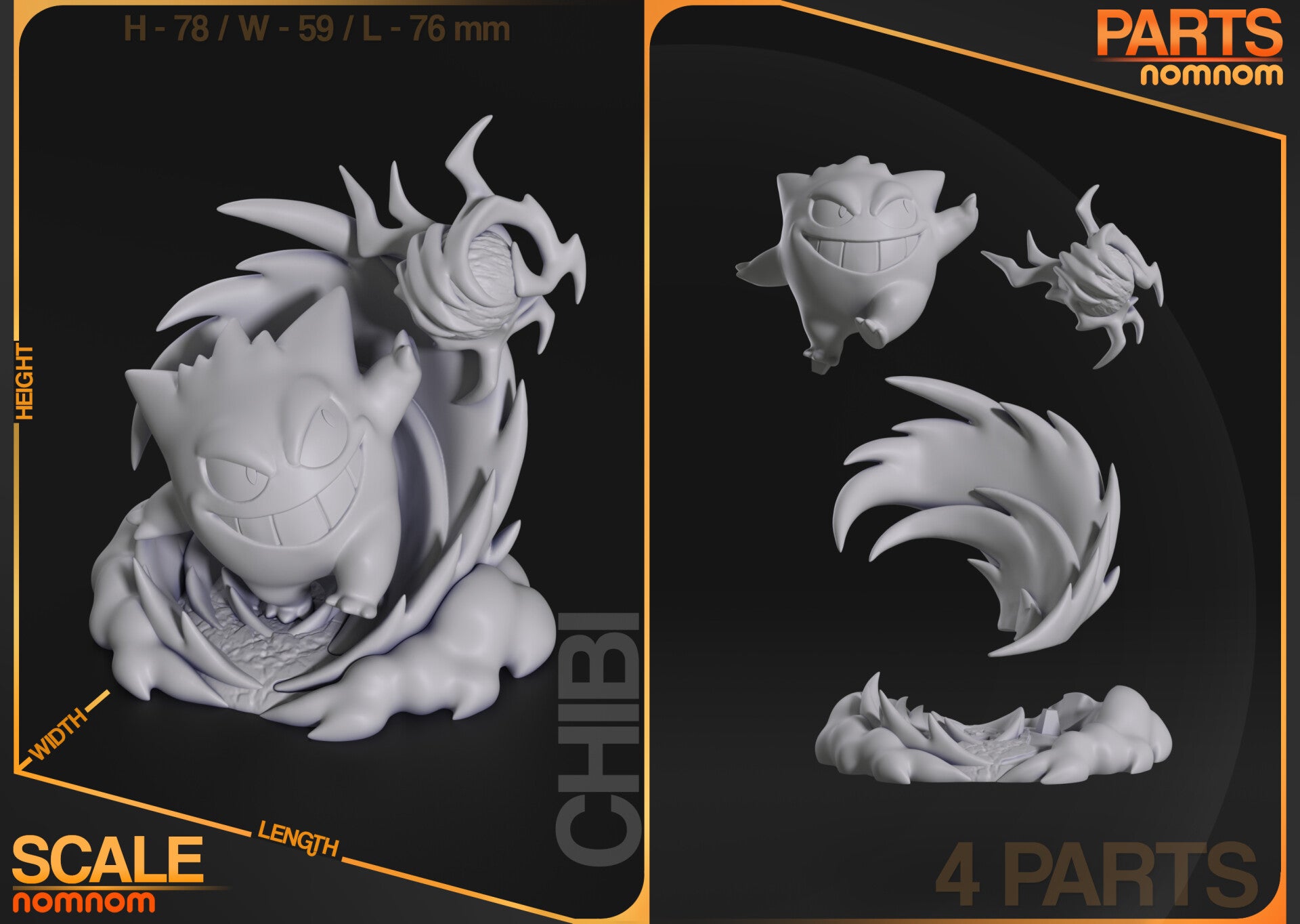 Summon the mischievous spirit of the Pokémon world with this premium 3D printed Chibi Gengar figure! Meticulously crafted to capture the playful yet eerie charm of everyone's favorite Ghost-type, this NomNom Figures design showcases Gengar emerging from shadowy flames with its signature wide grin and troublemaking expression.